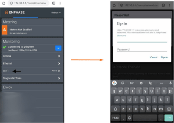 • On the Gateway Configuration page, tap on Wi-Fi in the Monitoring panel. When prompted, provide the Gateway Username (envoy) and password (last six digits of the Gateway's serial number).