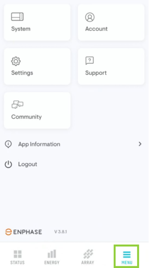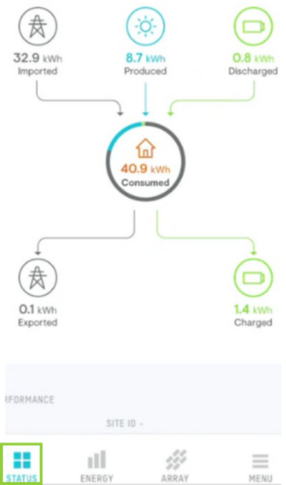 Once you login to the Enphase Enlighten app, the Status Page will be the default opening screen. This page is designed to give you quick insights to your system as well as checking the current system status (as noted by the indicator at the top of the page).