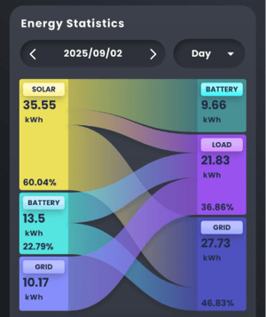 Energy statistics: This diagram shows how energy is distributed within a household. At first glance, the graph can seem confusing. The left column represents the sources of energy (solar, battery, and grid). The right column shows where the energy is delivered (battery, load, and grid). The middle section illustrates how different energy sources are split across your system. For example, the diagram on the left shows that solar production contributes primarily to charging the battery, partially to the household load, and mostly to exporting energy back to the grid. The battery discharges to support the household load and also supplies energy back to the grid. Energy drawn from the grid covers any household demand not met by solar or the battery. |
