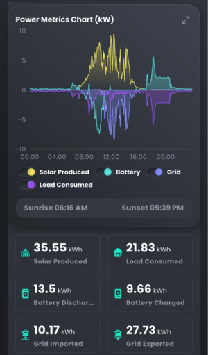 Power Metrics Chart: This chart provides a breakdown of your production versus your consumption. Anything above the line represents energy being supplied, while anything below the line represents energy being used. Here’s a breakdown of each component: