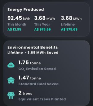 Energy produced: Provides figures for the amount of energy your system has produced over different historical time periods (month, year and lifetime). This section also provides insight to your overall profits during these time periods. Environmental benefits: A short summary of your system’s environmental impact, including reductions in CO₂ emissions, reduction in coal used and the equivalent number of trees planted. |