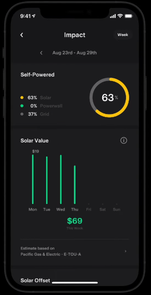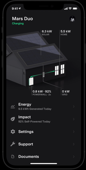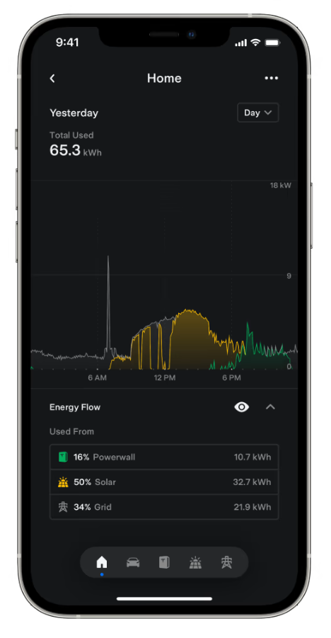 The energy tab is split into 5 main sections. For each section, the app provides you with an overview of the systems energy consumption and where the energy is being used. Grey represents power provided by the grid, yellow represents provided by your solar array, and green is energy being discharged from your battery.
