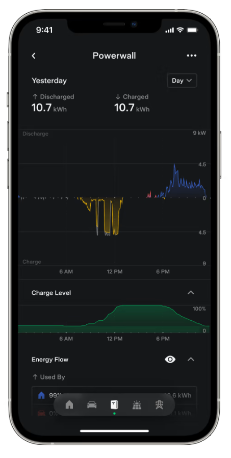 - Powerwall: This splits into two sections. The first is the charging/discharging rate of your battery. If it's above the line, it's providing energy to either your home or EV. If it's below the line, it is currently charging. The second section is a timeline of your battery's charge over the selected period.