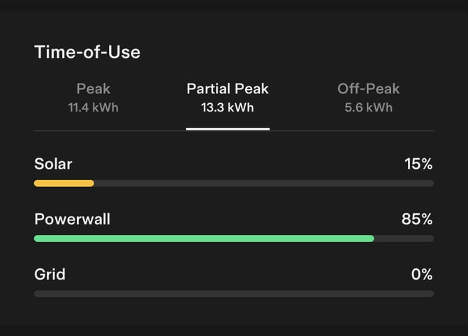 Time-of-Use: Displays what your consumption is in different periods during the day. Each tab also provides a breakdown of where energy is being drawn from. |